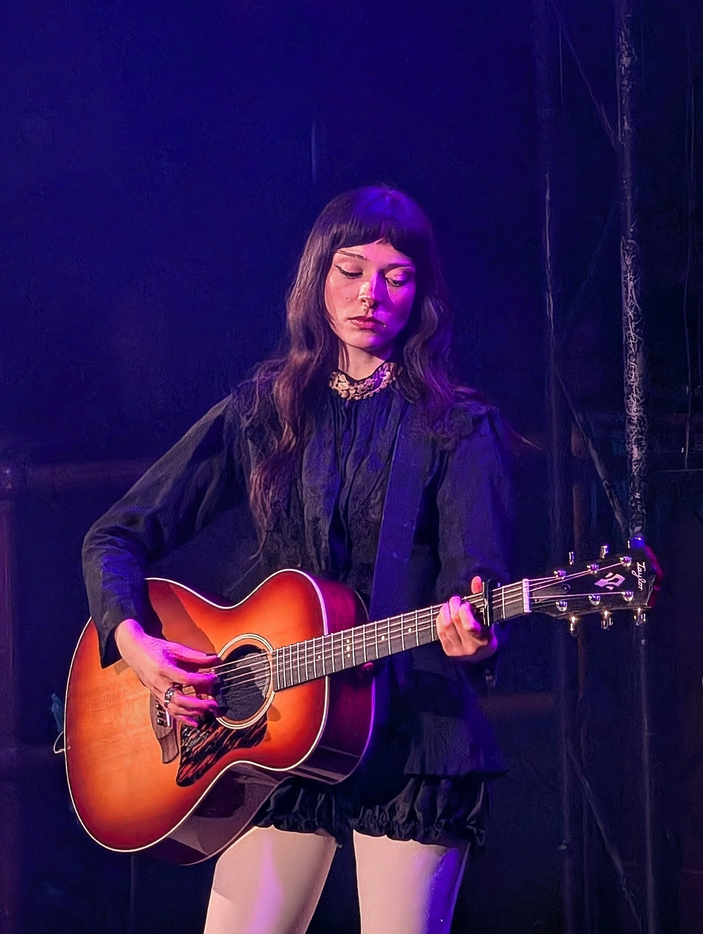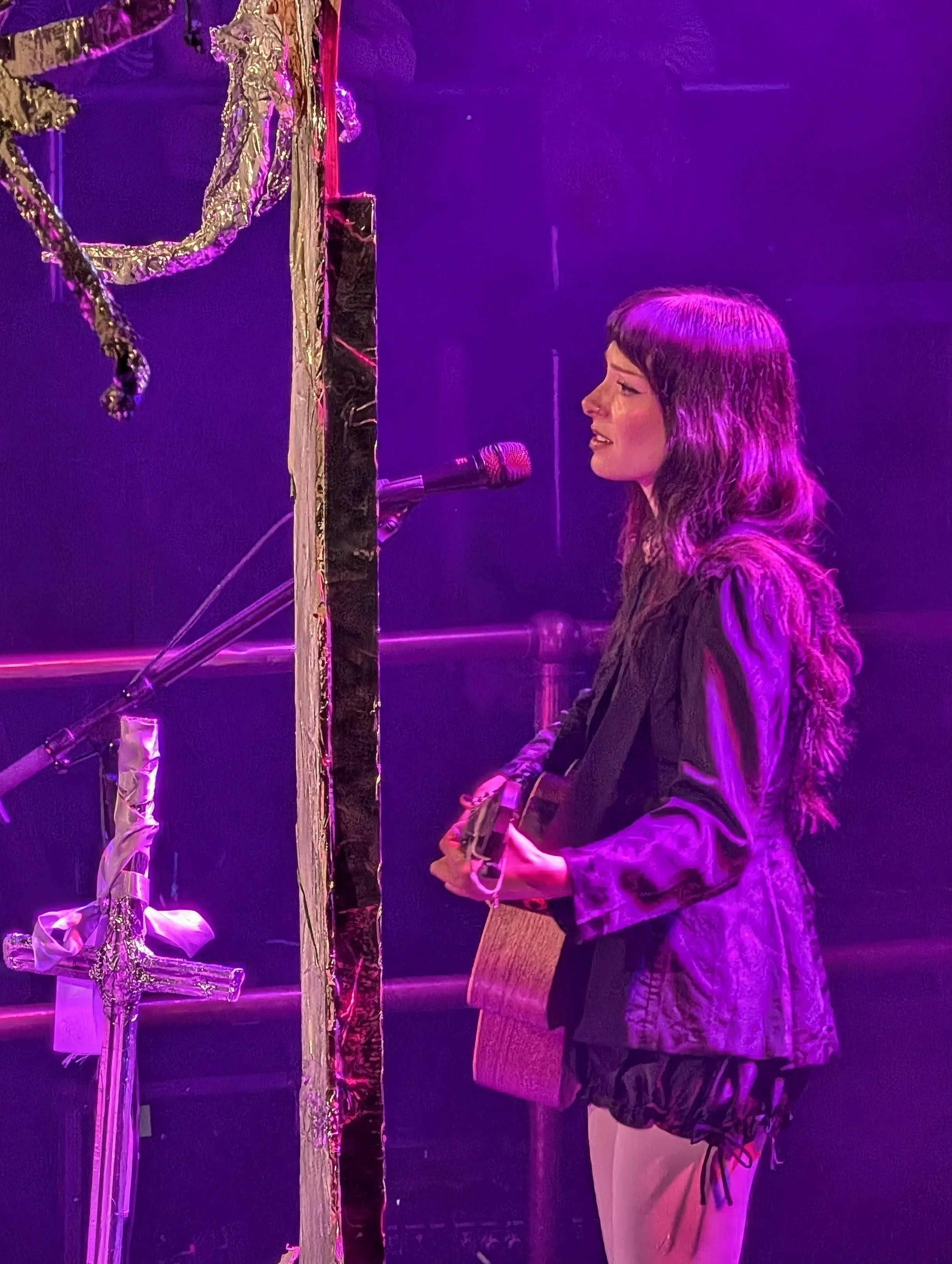 Dressed in corded black bloomer shorts, pure white tights and knee-high boots, her look is avant-garde troubadour chic. The gothic Victorian styling continues into the barren woodland set and graveyard cross decorating the stage.